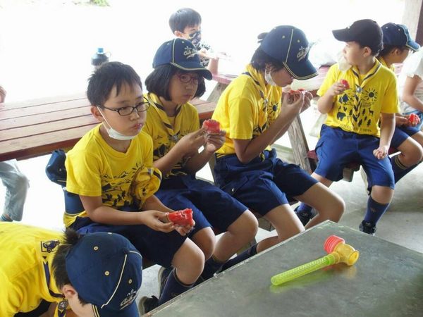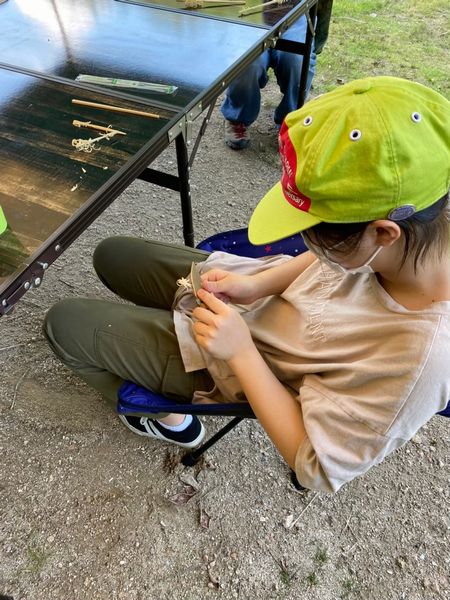 みんなおなかいっぱいになったあとは、小川であそんだり、トンボや虫たちと戯れたり、ボーイ隊がたててくれたテントに入ったりして楽しみました。入隊したばかりのお友だちもみんなとすっかり仲良しです。