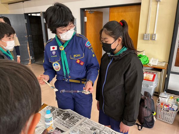魚拓つくりにも挑戦しました。生きている魚を魚拓にするのは大変だったので、ボーイ隊のおにいさんに、お魚をおとなしくしてもらいました。ボーイ隊のおにいさん、ありがとう。手つきがあざやかでした。
