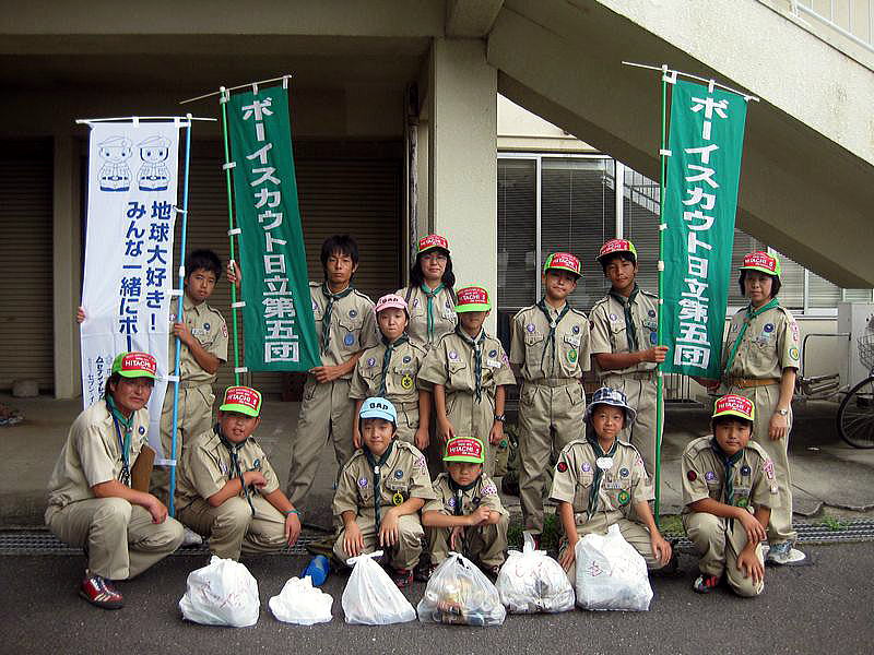 いっしょにお手伝いをしたボーイスカウト日立6団、日立8団のスカウトと整列! 今日のふりかえりをしました。 おきてのひとつ「スカウトは誠実である。」 |