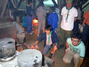 1日目の夕飯。 共同炊事場での薪での炊事でした。 メニューは親子丼でしたが、オリジナル料理が、おいしそうに出来ました。 まずは、上々のスタートです。 |