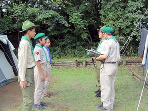 | 朝食の後は、朝の点検です。 隊長が、スカウトの健康状態やテントサイトの状況をチェックします。 | |