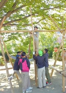 スカウトフェスティバルでメリーゴーランドを作成! 大型構築物に初挑戦。みんなの力をあわせてこそ安全に作成できるんだな。 |